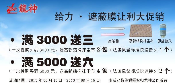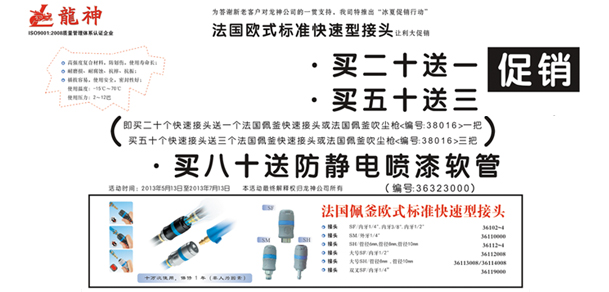 法國(guó)佩釜快速接頭促銷(xiāo)方案(產(chǎn)品編號(hào):36102000-36119000)一、主題:“冰夏”促銷(xiāo)行動(dòng) 二、目的:回饋新老客戶(hù),讓利大反饋 三、時(shí)間:1、 啟動(dòng)時(shí)間:2013年5月13日 2、 結(jié)束時(shí)間:2013年7月13日3、 時(shí)長(zhǎng):2個(gè)月 四、活動(dòng)內(nèi)容:1、 買(mǎi)二十送一(即買(mǎi)二十個(gè)快速接頭送一個(gè)法國(guó)佩釜快速接頭或法法國(guó)佩釜吹塵槍?zhuān)ň幪?hào):38016)一把) 2、 買(mǎi)五十送三 3、 買(mǎi)八十送防靜電噴漆軟管(編號(hào):36323)五、其它 1、本活動(dòng)最終解釋權(quán)歸珠海龍神所有。