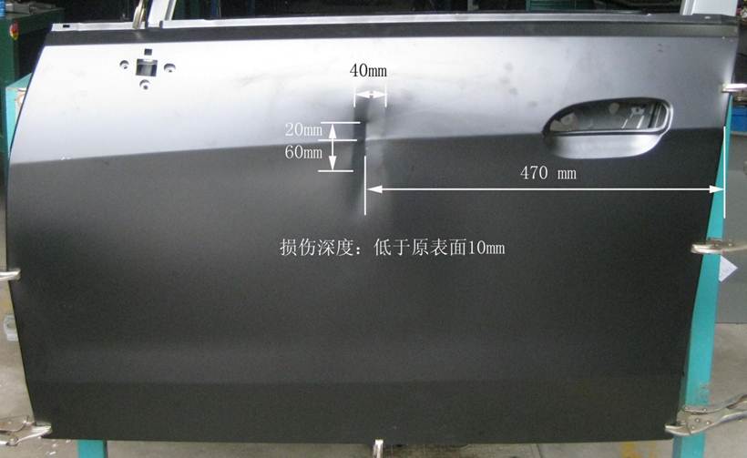 2013年車身修復大賽受損門板修復項目技術(shù)方案的補充說明 2013-05-16 19050 2013年車身修復大賽受損門板修復項目技術(shù)方案的補充說明 1、受損門板項目的受損位置及尺寸圖片、作業(yè)要求(1)作業(yè)要求在40分鐘內(nèi),對雪佛蘭新賽歐左前門外板上的長80mm,寬40mm,深10mm的條形凹陷(漆膜已破壞)進行修復,凹陷損傷穿過車身線。