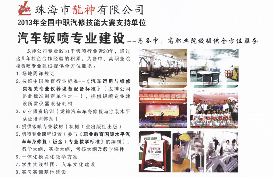 龍神汽車車身修復與涂裝 水平認證培訓體系 2013-06-03 25270 龍神公司專業(yè)致力于鈑噴行業(yè)近20年,通過這幾年校企合作經(jīng)驗的積累,為各中、高職業(yè)院校鈑噴專業(yè)建設(shè)提供全方位服務(wù)。